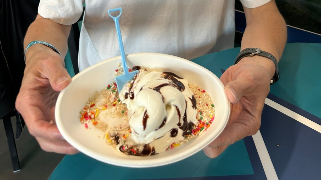 Hill says: It only resembles the contents of a litter box and fortunately doesn’t taste like one (not that I would know). This feline-omenal dessert — featuring vanilla ice cream and chocolate syrup atop a bed of graham cracker dust and rainbow sprinkles — comes with its own scoop. It’s featured on cat night — when cat owners are encouraged to bring their cats to the ballpark.