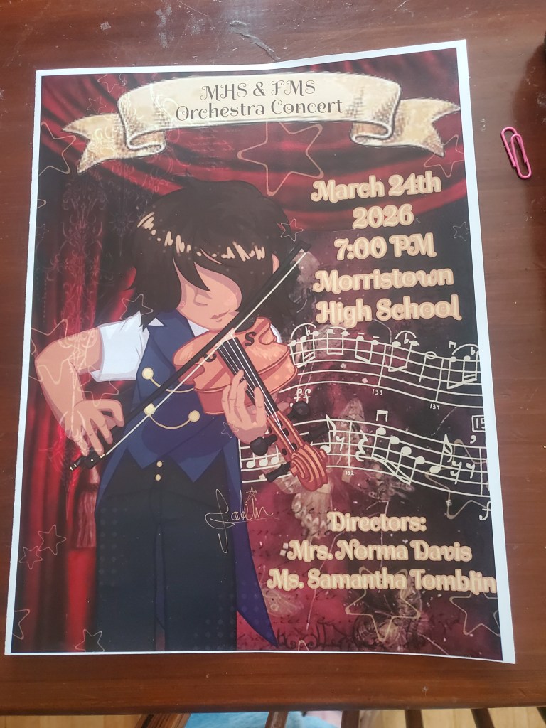 In happier (much) news, we attended a concert at Morristown HS last night. Our Robin’s in the orchestra as a violist, which is reason enough to be excited, but get this: she was asked to design the program cover. Caity said she really worked hard on it. She has been designing amazing character drawings on her PC for years and I guess people know about it. Anyway, it came out great, see below, and she received a very nice credit for it in the program itself and was personally thanked by the orchestra leader on stage. You can see Robin’s signature on it to the left of the word “Directors.”