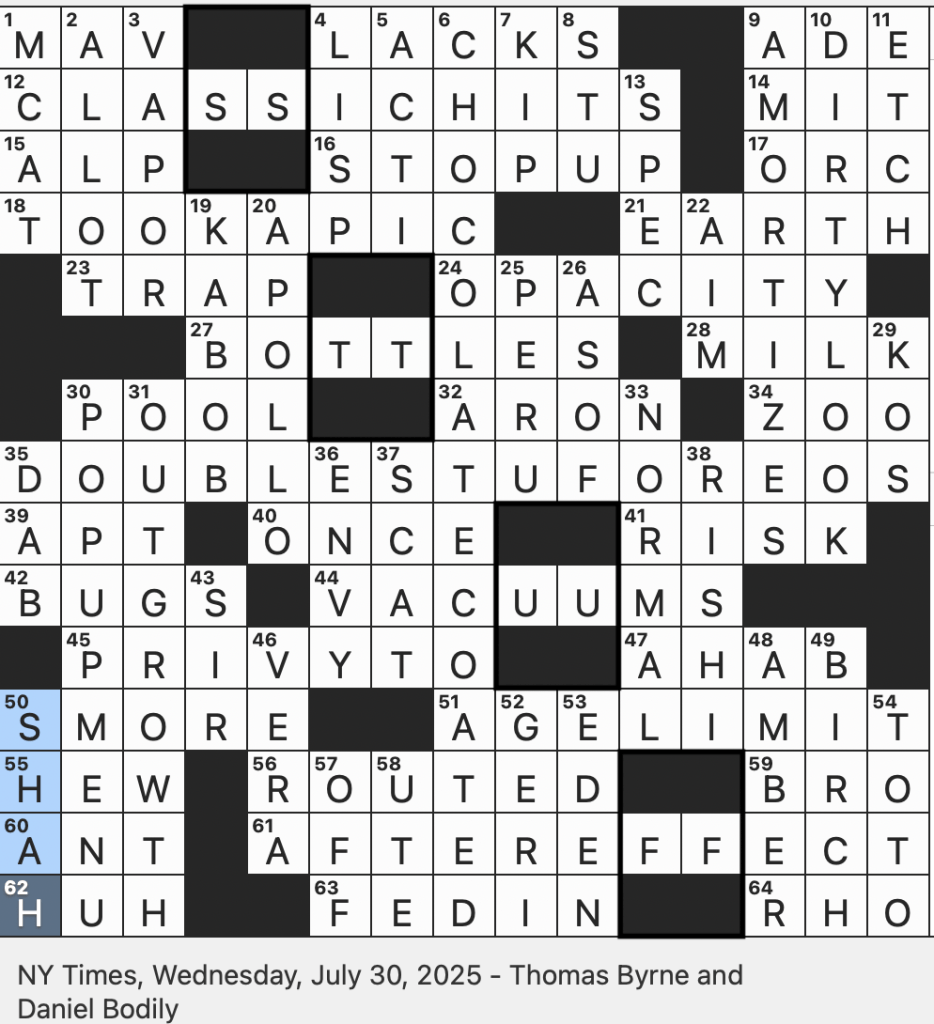 The theme of yesterday’s puzzle was Open Seas, meant to focus on the letter C. So all of the theme answers were limited to words starting with C, e.g., Caitlin Clark, cash crop, card counting, and Coca Cola Classic. It was Caitlin Clark’s first appearance in the NYTXW. But, get this — even more impressive IMO — every single clue, across and down, started with the letter C! 78 clues. This trick was handled so smoothly that I didn’t even notice it until it was pointed out by Rex in his blog. Bravo Brian Callahan. Mr. C.