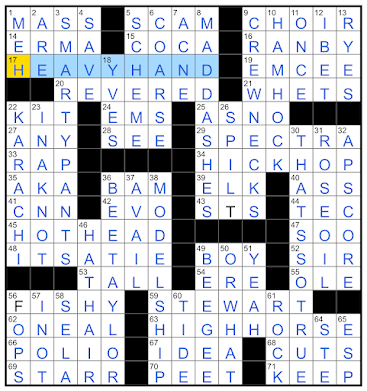 Taylor Swift popped up in the clue at 34D: “Reality show whose cast appeared in the music video for Taylor Swift’s ‘You Need to Calm Down.’” The answer was QUEER EYE. Take a look/listen: